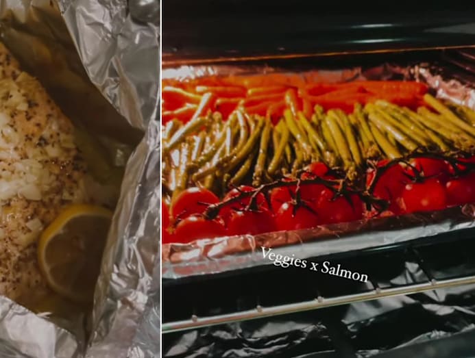 Yummy factor: Despite feeling exhausted, Kimberly kept her word and made dinner for her fam. Safe to say, we're loving the riot of colours on her menu — oven-baked salmon fillets topped with plenty of chopped garlic and lemon slices, as well as asparagus, skinny carrots and vine-ripened tomatoes.
