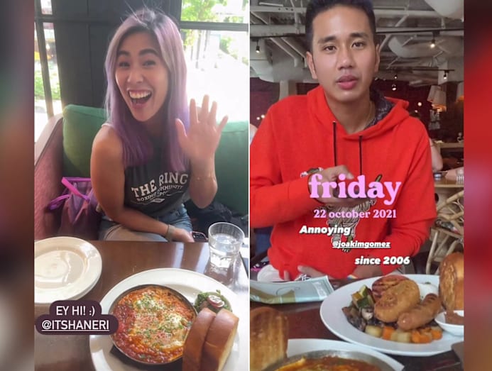Yummy factor: The Singapore Idol alums met up at all-day breakfast spot Wild Honey for hearty, mouthwatering eats. Daphne went for the Tunisian, a spicy shakshuka dish with chorizo, eggs and brioche toast, while Joakim had a classic English breakfast with poached eggs, streaky bacon, sausages and more. Yum.