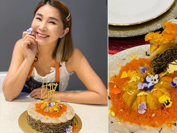 Yummy factor: Because her family doesn't have a sweet tooth, Xiuhuan decided to switch things up for her hubby’s birthday and make a savoury “cake” instead with angel hair pasta. Seasoned with truffle oil, ponzu sauce, and nori powder, the yummy carbs were topped with Hokkaido scallops, buttery uni, juicy ikura and a touch of edible gold flakes and flowers.