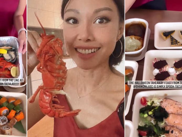 Yummy factor: Jamie and her family enjoyed a Halloween takeaway feast courtesy of Shangri-La Singapore, comprising plenty of devilicious eats like Fire Eater Butter Chicken with naan and papadam, and desserts decorated with cobwebs and more. Her favourite, however, seemed to be the seafood platter with prawns, oysters and lobsters galore.