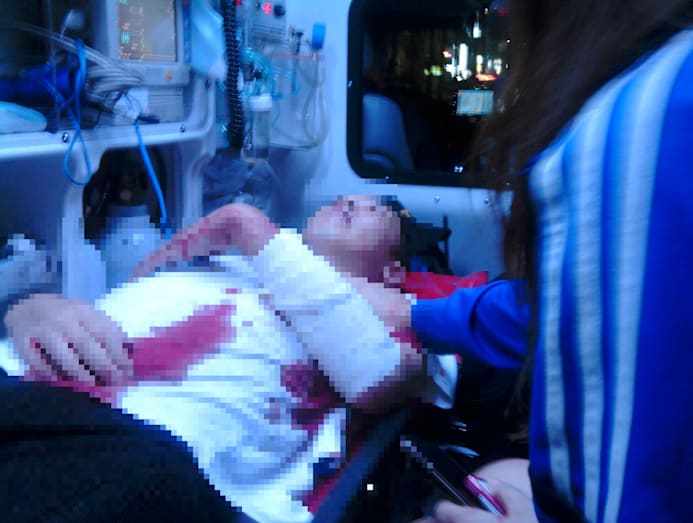 There will be blood: A deserter being rushed to the hospital after he stabbed himself in front of Song.