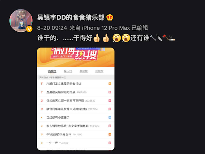 Sharing a screenshot of his son being blacklisted and making it to the top of the Weibo trending topics list, the actor wrote, “Who did this. Good job. Who’s next.”