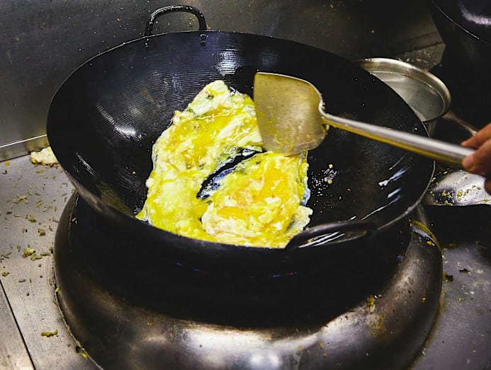 Fragrant Thai rice is steamed with a less than usual amount of water to rice for dryer grains. This allows them to be fried within 45 minutes of boiling, rather than after a night in the fridge (using leftover rice is the norm for fried rice). The hawker cracks eggs into the woks before stirring them. Once half-cooked, he adds the rice.