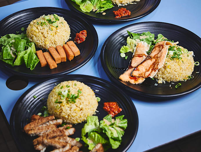 Like their name suggests, they serve up egg fried rice — Din Tai Fung-style, which means without bits and bobs speckled within the grains, like char siew, crab stick or other accompaniments you’d find at zi char joints. What is typical of a zi char stall however, is their sambal belacan, served on the side. Toppings-wise, there are seven types: pork chop and shrimp, as well as salmon teriyaki, an omelette with Japanese curry, and stir-fried beef and onions. Everything comes with a simple salad of shredded lettuce and Kewpie sesame dressing. Soon Ping handles a pair of woks, while Fanny manages the deep-fryer, packing and plating of food.