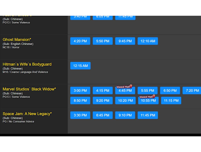 How to buy Vaxed Hall tix: This is GV Paya Lebar's showtime schedule for Friday (July 16); just click the slot with the ‘Vaxed Hall’ icon.