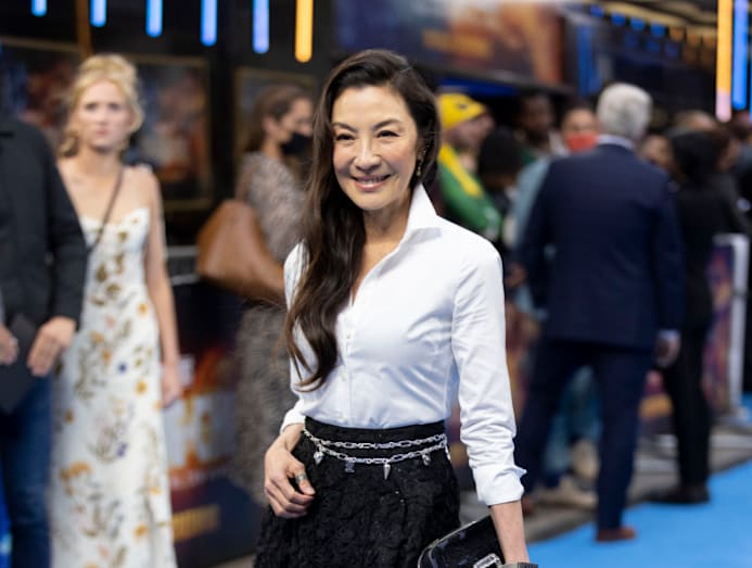 The legendary Malaysian actress, who plays Shang-Chi’s aunt Michelle Yeoh, dazzles in this crisp white Pye shirt and skirt from Shiatzy Chen. Shang-Chi is Michelle’s second MCU movie; she was also in Guardians of the Galaxy Vol. 2, playing a different character, Aleta Ogord.