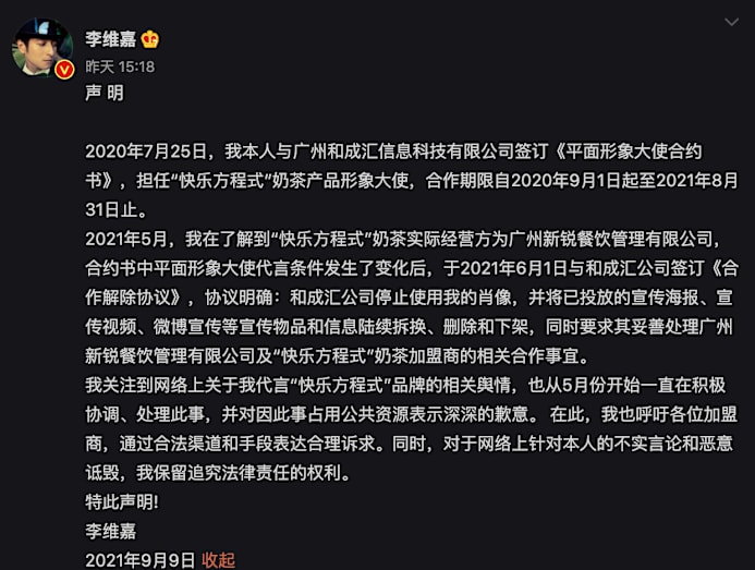 Weijia has since explained himself on Weibo with this statement: “On July 25, 2020, I signed an endorsement contract with Guangzhou Hechunghui Information Technology to serve as the ambassador of Happy Formula milk tea products from September 1, 2020 to August 31, 2021. This May, I found out that Happy Formula is a product of the Guangzhou Xinrui Catering Management, and on June 1, I contacted Hechunghui. We cancelled our contract [as the] conditions had changed, and they agreed to have my photos removed from the brand.”