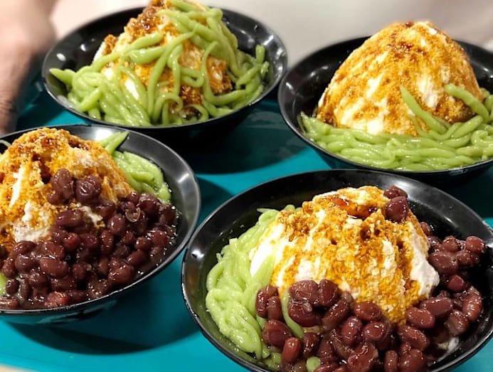Camera-shy Dora is a former insurance agent who now manages her chendol biz full-time. She learnt the basic chendol recipe from a Malaysian hawker who used to sell the dessert in Johor, but made some modifications to it. She adds: “There are three main components to chendol: the jelly, gula melaka and coconut milk. The jelly, which is the chendol, is very time-consuming to make. One batch takes four hours. It’s made from white rice flour and pure pandan juice, and requires constant stirring, which we do in a commercial mixer. We also grind our own jasmine rice flour using a stone grinder”. Super artisanal.