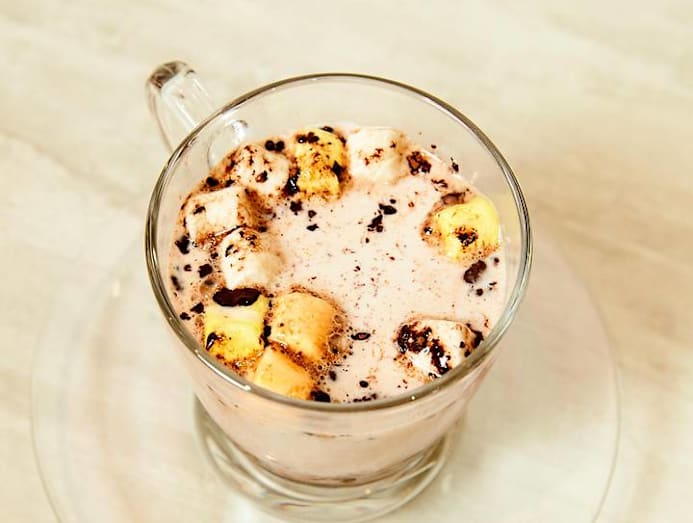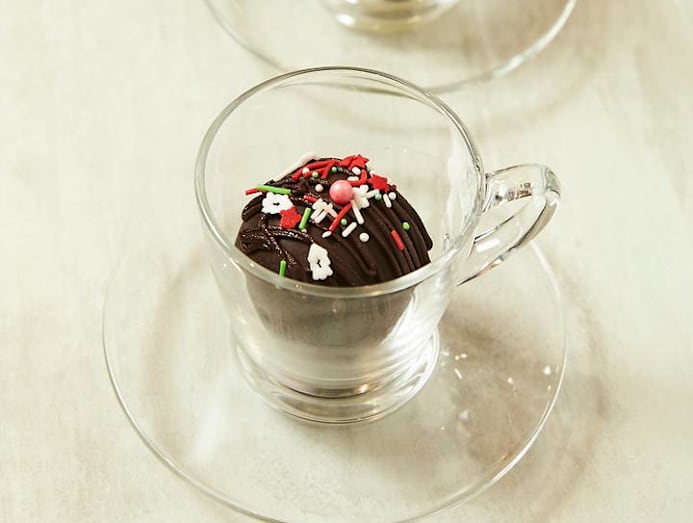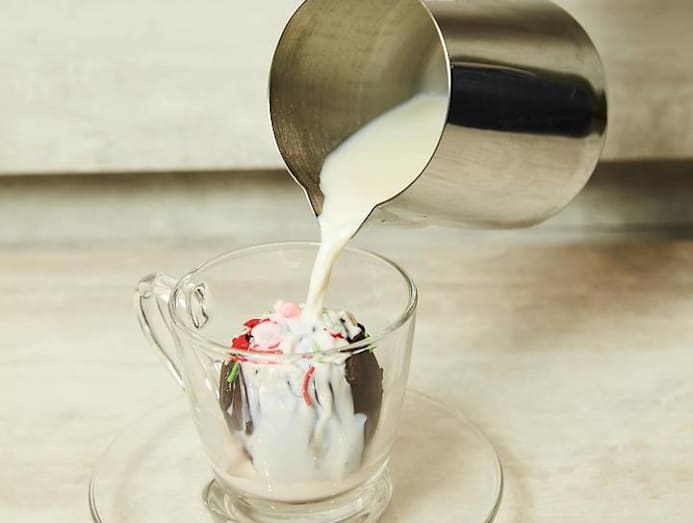 A chocolate orb is dropped into an empty glass, before steaming milk is streamed over it. Slowly, the orbs melt and crack to release either matcha or cocoa powder. We prefer the cocoa one — creamy, Christmassy and not too sweet. As you stir it with a spoon, the chocolatey hit become more