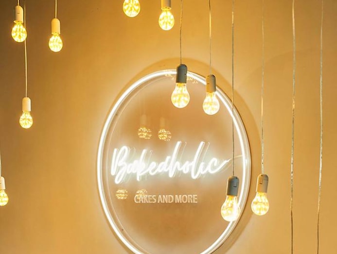 Cafe Bakeaholic is split into two sections: The first has the gold-trimmed glass and marble counters where customers will place their orders, while the second has the kitchen entryway and a cute lightbulb-framed photo-taking spot (“very millennial, I know,” laughs Charmaine). Pastel murals adorn the walls.