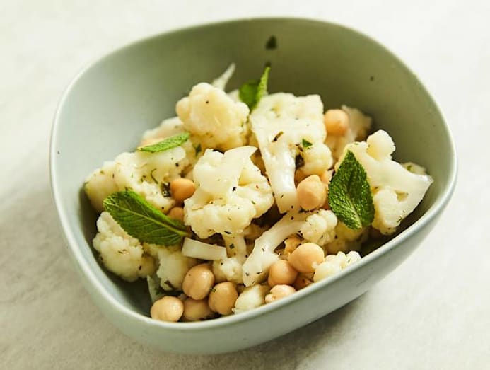 At first glance, the Cauliflower and Chickpea Salad looks rather plain. But the salad is surprisingly yummy — crisp overnight-marinated cauliflowers, a zesty well-balanced dressing, and creamy chickpeas to round it off.