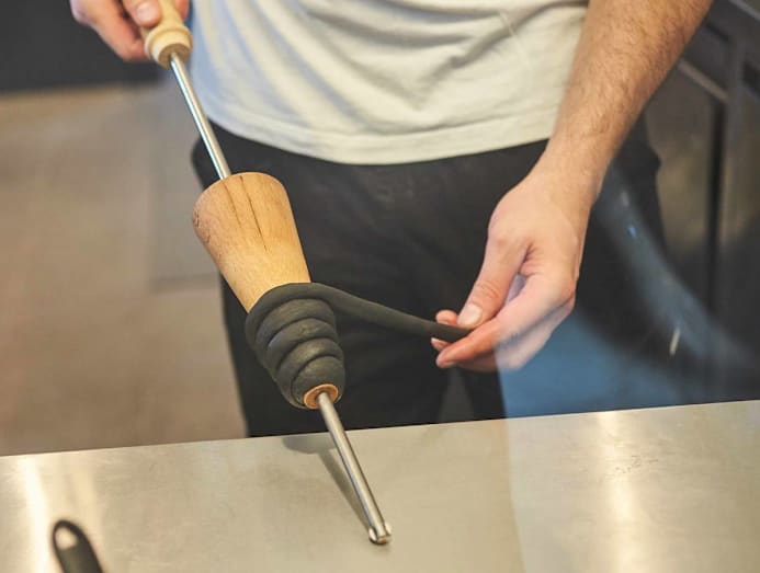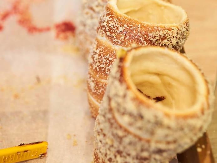 According to Rayner, some chimney cones are deep-fried like doughnuts. The ones at Good Food Chimney have a more bread-like texture and are baked in an electric grill instead. Balls of dough, made fresh daily with locally sourced flour and a “secret ingredient” from Prague, are lightly greased with sunflower oil, hand rolled into long tubes and wrapped around a cone-shaped baking spit. The uncooked dough cones are then rolled in granulated sugar and baked in a small rotisserie-like combi oven for five minutes at 250 degrees till the surface caramelises and turns golden-brown. House made, locally sourced 40 per cent dark Belgian chocolate is piped in to plug the hole at the bottom of the cone, which is then dusted with your nutty condiment of choice and cooled before being served.