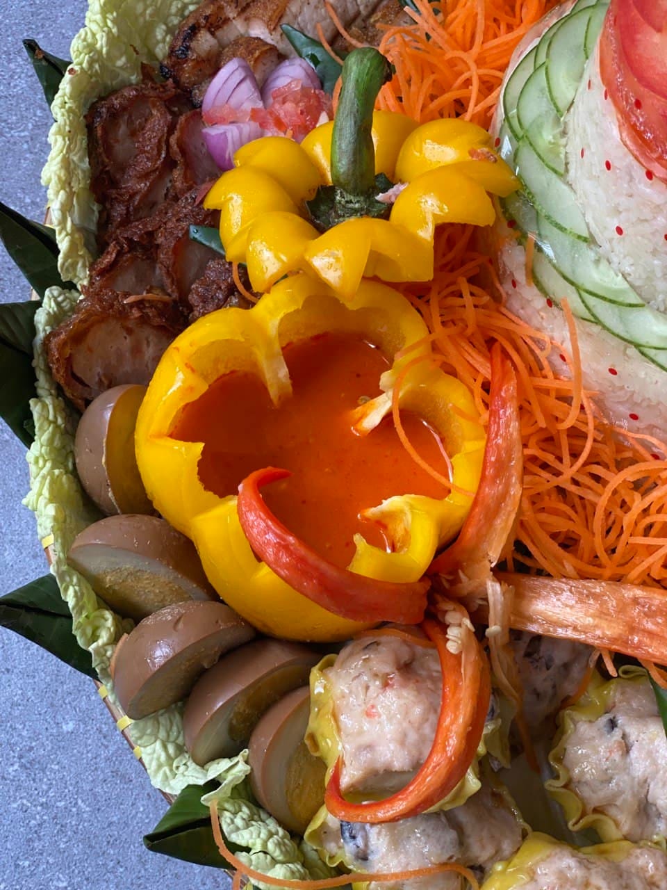 You can order it in Singapore (check out this home-based nasi tumpeng biz which counts Zhu Houren’s Indonesian-born wife as a fan) from places like Indonesian restaurant Kota88, which has launched a mod Nasi Campur Babi Meriah ($98.88++) that’s good for five pax. Despite having ‘nasi campur’ (aka Indonesian-style cai png) in its name, it’s served like fancy nasi tumpeng.