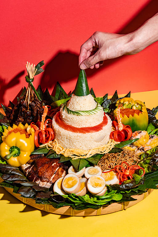 The traditional Indonesian dish, nasi tumpeng, is usually served only on formal occasions. An elaborate rice platter similar to nasi ambeng, it consists of a cone-shaped mound of rice surrounded by a myriad of meat and veggie side dishes.
