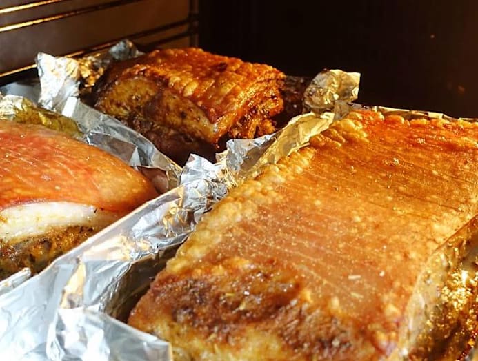 After buying the slabs of pork belly fresh from the market, Junlong will score the skin of each slab, before leaving it to sit in its marinade for 24 to 48 hours in the fridge. After it has been marinated long enough, the meat is taken out on the day of delivery, and roasted for about two hours in his modest conventional oven before being left to rest. It’s first slow-roasted at a low temperature, before being broiled at the highest setting to finish — the secret to the crispy skin and juicy meat, says Junlong.