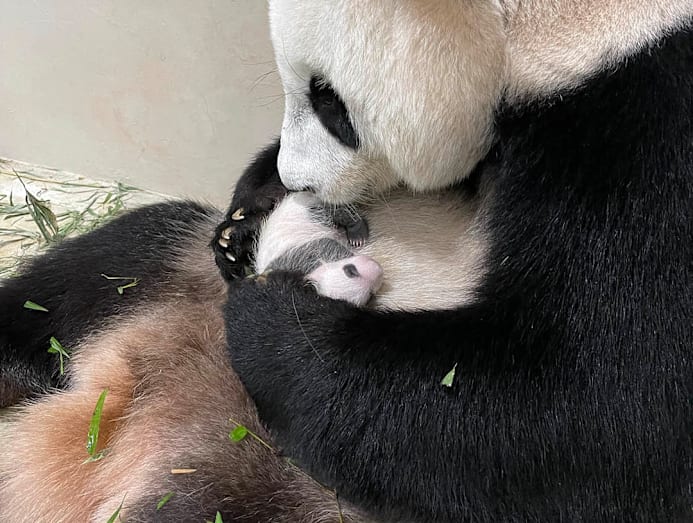 The giant panda cub at 23 days old with mama panda Jia Jia.