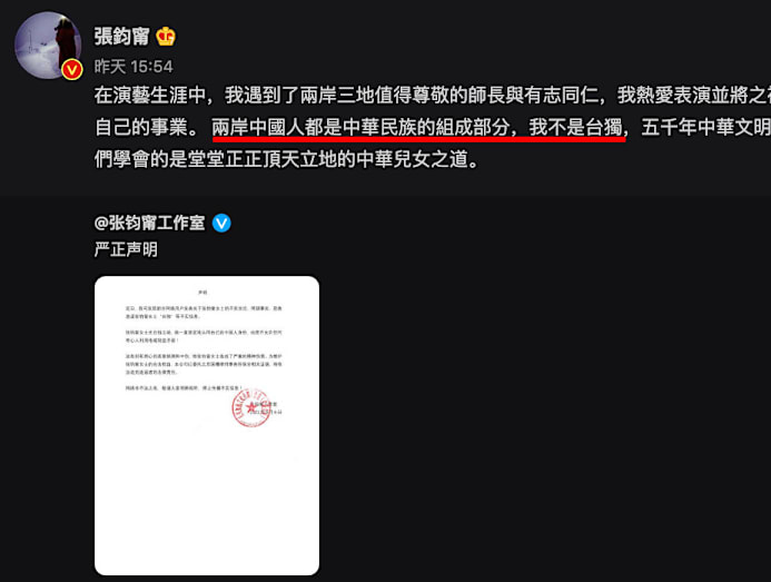 Netizens took Janine's statement to mean that she thinks of Taiwan and China as two separate entities, which of course led them to accuse her of “betraying” China while raking in money from mainland dramas.