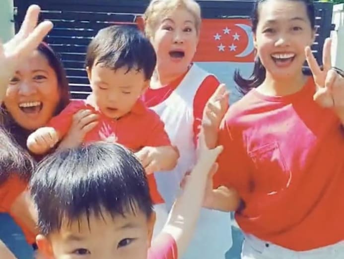 Dressed in their best red-and-white outfits, the trio danced to BTS’s 'Permission to Dance' outside Yinji’s house with the Singapore flag in the background.
