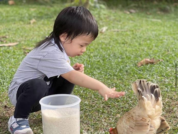 Just like Joanne Peh, it looks like former Mediacorp actor Vincent Ng, 45, is very much a fan of holistic development, with the wushu star posting a picture of his three-year-old son, Zander very bravely feeding a chicken.