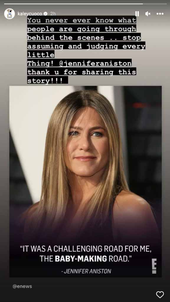 Thank you for sharing: Kaley Cuoco responds to Aniston's IVF struggles on an Instagram Story post.