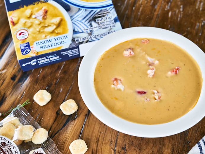 An indulgent soup with lobster chunks and cream. Just pop into a microwave oven and slurp away.