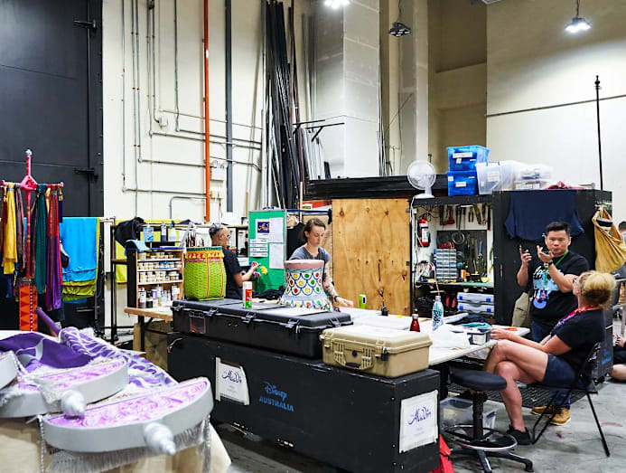 Why is there someone hand painting a Merlion figurine backstage at Aladdin? The man with all the answers and our tour guide for the day, Disney Theatrical Productions production company manager, Matt Henderson explains: “We do a little bit of local flavour everywhere we go. [There’s a scene] where the genie pulls out something from his pocket. In New York, it’s the Statue of Liberty. In Australia, it’s Vegemite.”