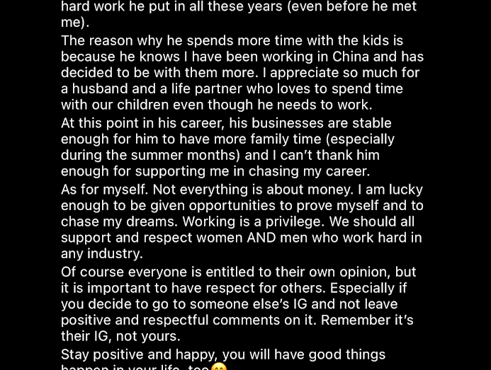 “The reason he spends more time with the kids is because he knows I have been working in China and has decided to be with them more,” she continued, adding that she’s thankful for a partner who loves being with their children even though he needs to work.