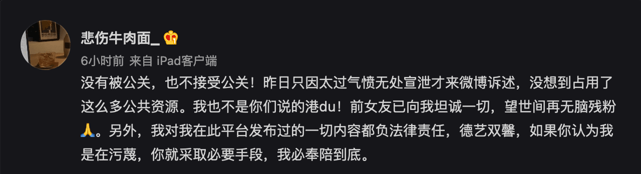 “I take legal responsibility for all the content I have shared on this platform. De Yi Shuang Xin, if you think I’m slandering you, then you should take the necessary measures, and I will accompany you to the very end, he wrote.