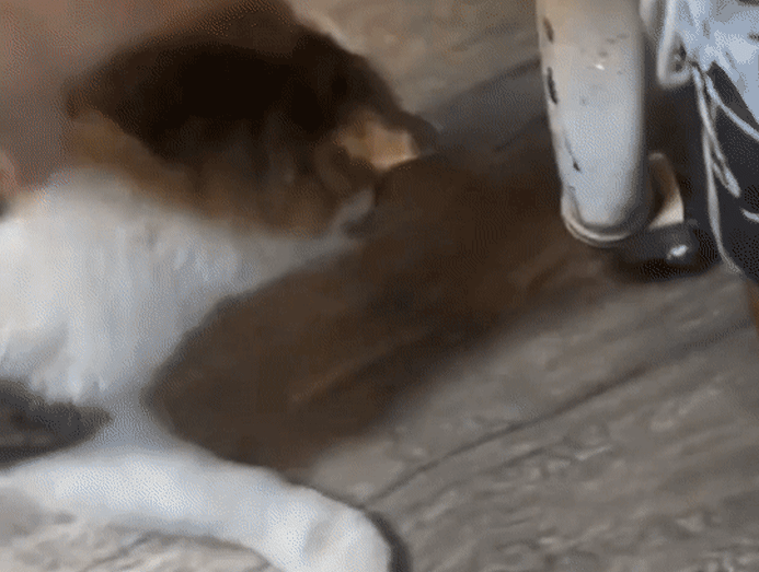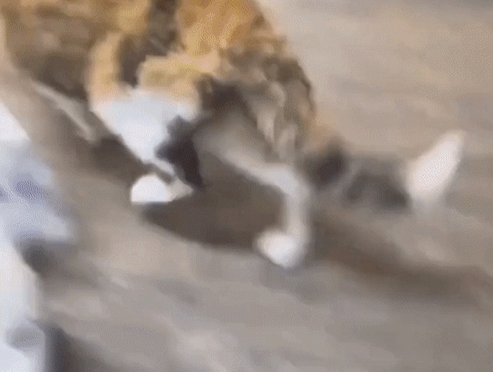 Winter then proceeds to meow at the cat. The cat appeared to be taken aback before making a swift retreat.
