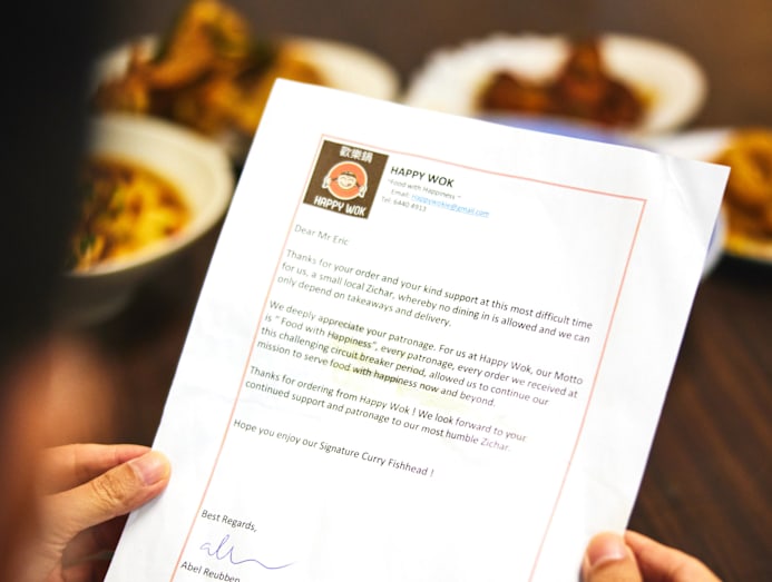 Business has gotten better ever since dining-in was reinstated in July last year. “Now, whenever I see the people who used to order from me during the circuit breaker dropping by to eat, I feel so much gratitude for how they’ve helped Happy Wok stay alive,” shares Abel. Even though Happy Wok has yet to break even, he’s confident that his dedication to serving his customers will help him capture a steady base of regulars. Abel says he still pens letters for new customers occasionally. He is at Happy Wok every day — serving, handling supplies, as well as doing admin and accounting work.