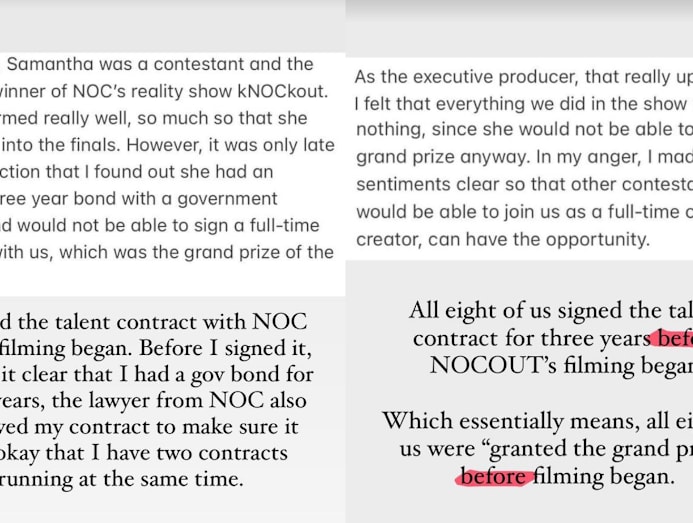 However, in a series of Instagram Stories posted today (Oct 14), Samantha, who is a full-time preschool teacher, clarified that she “signed the talent contract with NOC before filming [for kNOCk Out!] began”.