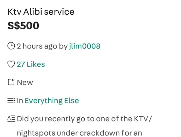 Listed simply as ‘KTV Alibi services’, the Carouseller then goes on to elaborate the nature of their services. “Did you recently go to one of the KTV/nightspots under crackdown for an innocent dinner and not expect to be involved in a serious Covid cluster where it is kind of awkward now to explain to your wife or girlfriend?” it reads.