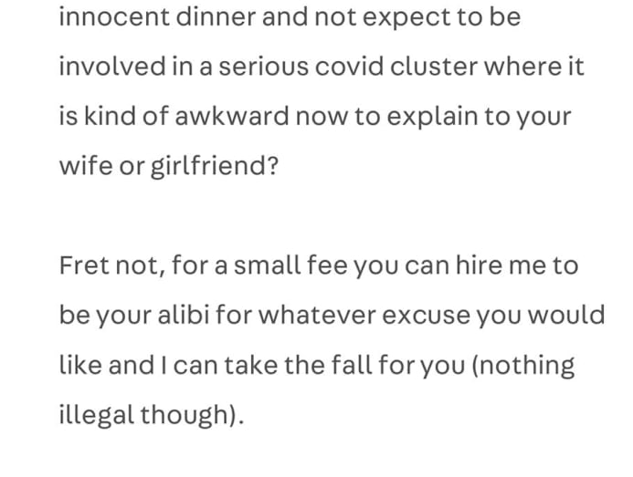 You're in luck. During Chinese New Year, you can rent a boyfriend or girlfriend to fend off questions from kaypoh relatives. During a pandemic, however, you can pay for an alibi to explain how you got caught in a Covid-19 cluster.