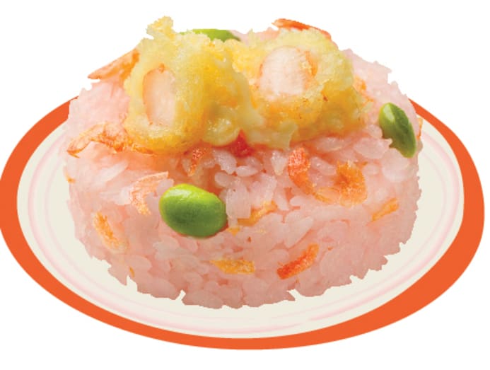Sakura flower-marinated rice ball speckled with dried shrimp and edamame beans, then topped with prawn tempura.