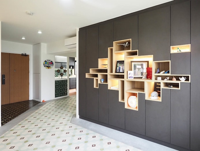 On the other side of the living area stands a full-height built-in cabinet that's an artful, abstract take on the Singapore map.