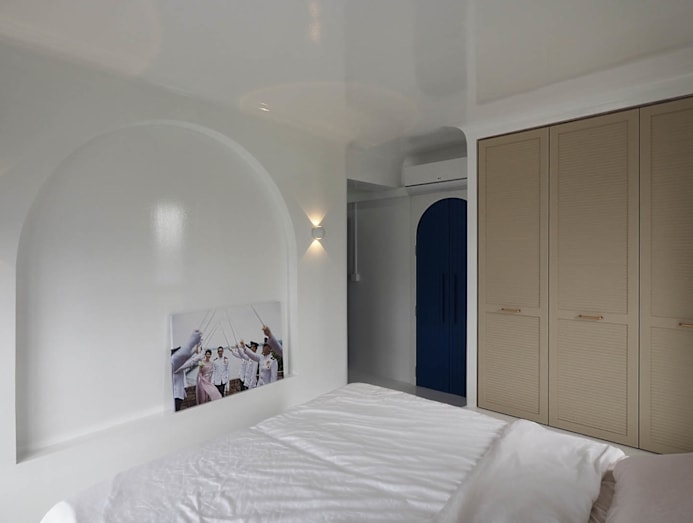 The design brief for the master bedroom and bathroom: To re-create the vacation accommodation that the homeowners stayed at during their trip to Greece.