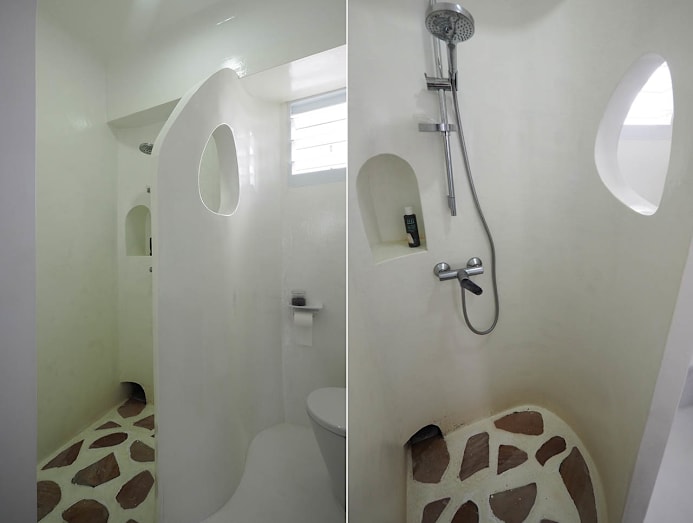 The walls and corners in the bedroom and bathroom were rounded off with plaster and epoxy finishes to eliminate sharp edges and create the organic forms, distinctive features of Santorini interiors.
