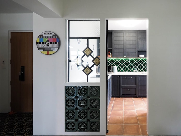 The Peranakan theme is evident in the kitchen, and it’s brought to life by the patterned wall tiles and cabinet knobs, which were provided by the homeowners themselves.