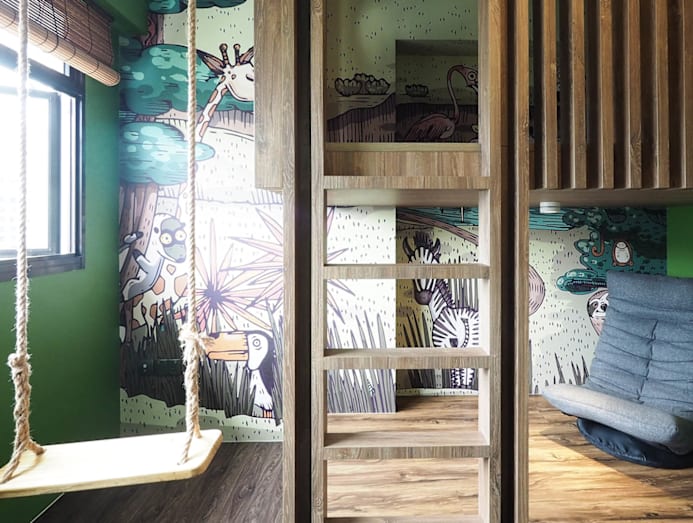 To up the fun factor, a treehouse bed frame, wooden swing and themed wallpaper were added.