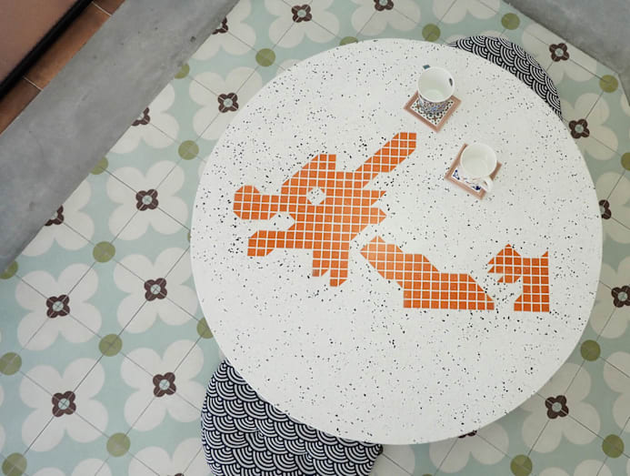 The centerpiece in this uniquely Singapore dining area is the custom low table reminiscent of old-school void deck tables. It even features a motif of the iconic local dragon playground.