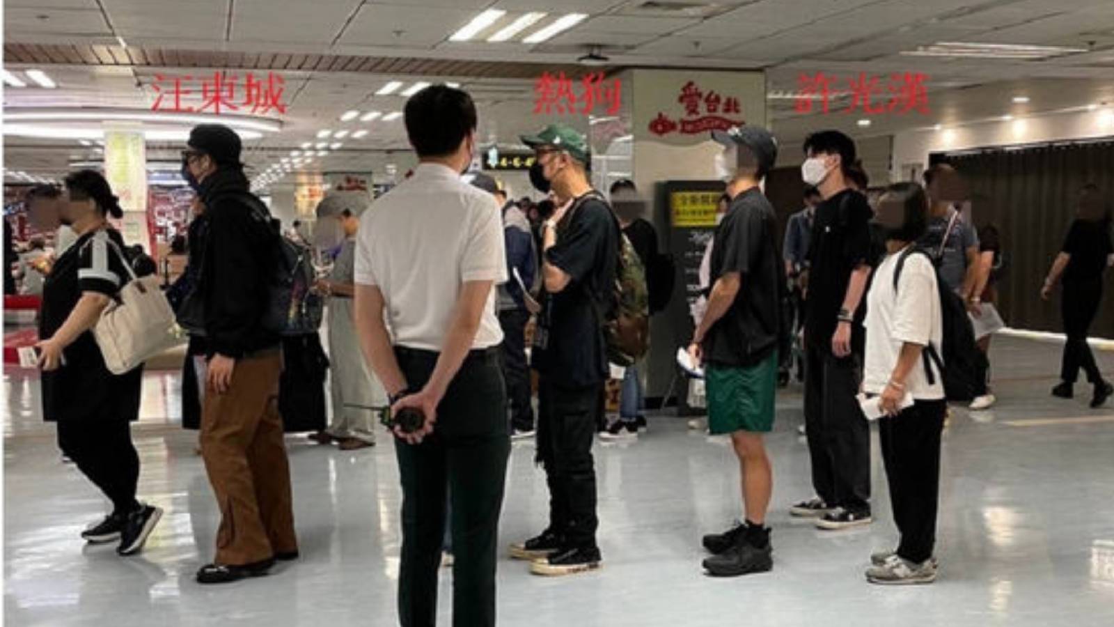 In a picture sent in by an ETToday reader, Taiwanese actor-singer Jiro Wang, 41, rapper MC HotDog, 45, and actor Greg Hsu, 32, can be seen standing in line while evenly spaced apart.