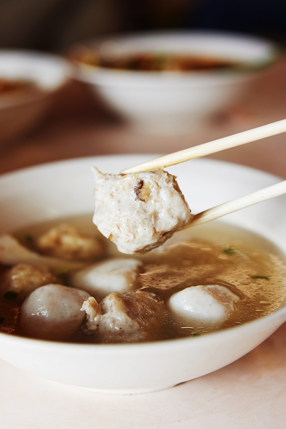 The Teochew meatballs, made from an equal ratio of minced pork to fish paste, are mixed with a host of ingredients like onions, chilli, coriander, garlic, hae bee, sweet cai poh, lard and fried shallots. Each orb, slightly smaller than a ping pong ball, is irregularly shaped and speckled with ingredients. “These ingredients are cheap, so I don’t mind adding more stuff to elevate the taste of the meatballs,” he says.