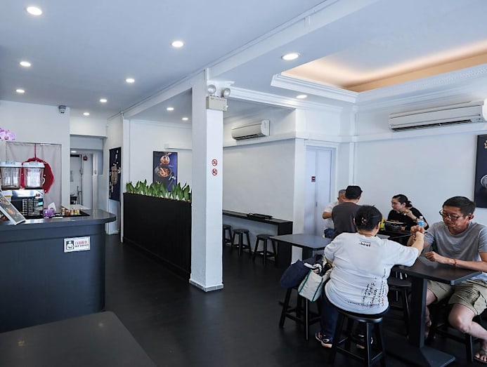 Having grown up in Toa Payoh, Chef Kang picked the heartland neighbourhood again to open his prawn noodle stall as a nod to his roots and a way to “reminisce (his) childhood”. The cosy air-conditioned eatery is utilitarian and simply decorated with white-washed walls and black furnishings, sort of like a stripped down modern take on traditional Chinese inns. You order and pay at the counter, then find a seat — your food will be served to you. “I plan to open one restaurant every year,” he tells us. “Each with its own concept.”