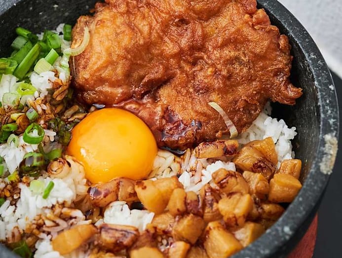 Chef Kang has fine-tuned his recipes since he first opened three weeks ago. The rich prawn broth, which he personally makes each day, uses 7.5kg of prawn shells and heads, “premium” hae bee from Hong Kong and 5kg of US chicken feet instead of the usual pork rib. “I use chicken feet instead of pork ribs ’cos chicken feet has collagen, which makes the broth smoother. With pork, it’s hard to maintain quality control. If you get a bad batch, the broth will be gamey.” There is also no added salt, sugar or MSG in his broth. The specially made low alkaline yellow noodles are served in a large earthen bowl with a halved deep-sea king prawn bursting with the goodness of the ocean, decadent golden cubes of melt-in-your-mouth fried pork lard and a crispy slab of prawn paste pork chop perched on a tonkatsu net. The broth, which is cooked for 16 hours, is robust and full of natural sweetness intermingled with the brininess of prawn. The chicken feet give the soup an almost milky smoothness while still being light. Although there is no added salt aside from what’s in the dried shrimp, the broth does pack a good salty hit, which does become a tad overwhelming as it starts to cool down. You can also request one top up of broth. Unlike the usual pork-based prawn broths which have a deeper, meatier taste, this one is lighter and sweeter while still being very robust.