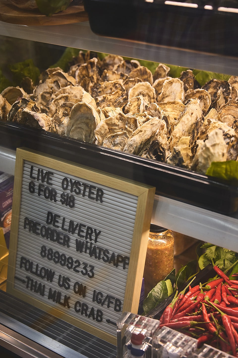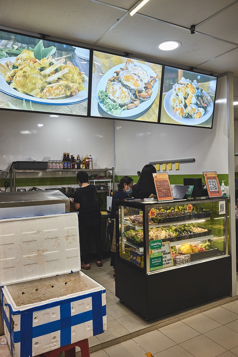 Though the stall is located near the entrance of the second-floor supermarket, it is easy to miss it due to the lack of a signboard. In its place are images of crabs hanging from the ceiling and a display chiller showing the day's fresh shellfish offerings. “We’ve been so busy, we never got down to making a signboard,” explains Kenny.
