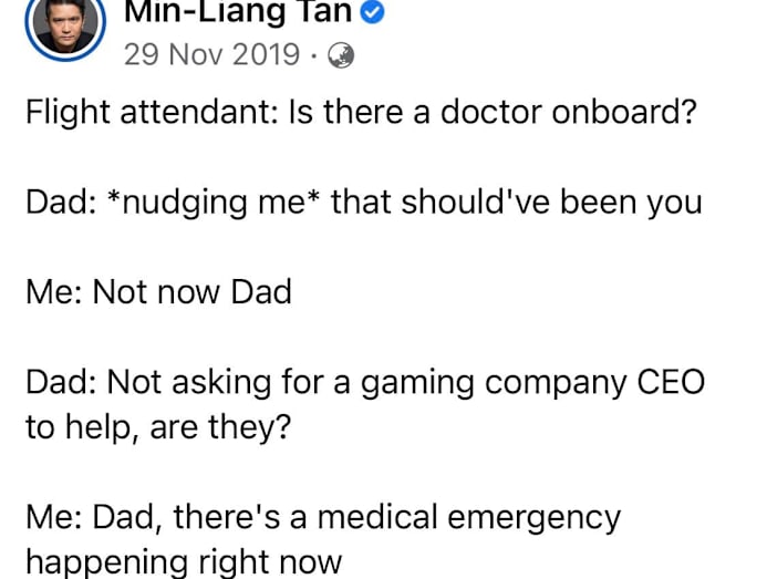 In 2019, Min-Liang also shared another amusing anecdote about being savagely roasted by his pragmatic dad on a flight.