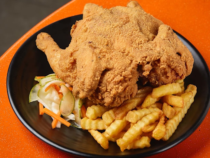 Each order comes with fries or rice and house-made achar. It’s a simple pickle of cucumber, radish and carrot in vinegar and sugar sans the usual peanutty chilli rempah. It’s a crunchy, refreshing side that cuts through the deep-fried fare it’s served with.