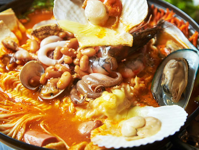 For $26.90, you get scallops, clams, mussels, prawns, squid, as well as your usual army stew suspects like luncheon meat, Korean fish cake, and instant noodles. The broth here is full-bodied and packed with a spicy punch. Shane’s business partner Richard Neo tells us that they make the soup base from scratch by boiling chicken bones and pork ribs for around five hours before adding dry spices, chilli powder and gochujang (red chilli paste). “Our army stew is a bit different from what you’d find at most Korean eateries. Those tend to have a slight powdery taste because they use powdered seasoning but we make ours from scratch,” he says.