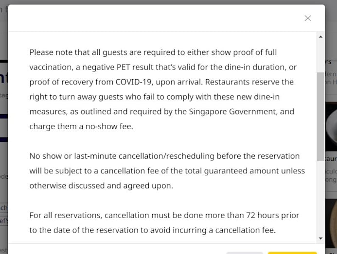 When making a booking through the Chope platform, a pop-up box detailing the vaccination-differentiated safe management measures must be acknowledged before customers can complete the booking. They must also tick a check box reiterating said measures further into the form.