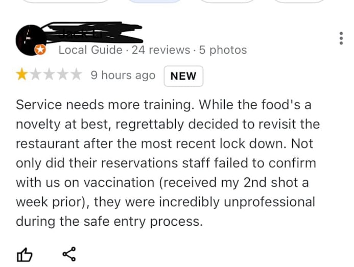 Following the incident, the guest left a one-star Google review (which Li Guang reposted on his Facebook on Aug 14) on the restaurant stating, “Not only did their reservation staff fail to confirm with us prior on vaccination (received my second shot a week prior), they were incredibly unprofessional during the safe entry process.”